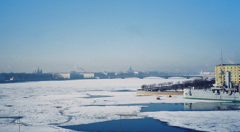 Our hotel, the aptly-named St. Petersburg, is fine. We have a wonderful view over the Neva River including the cruiser Aurora. Our room is accented with wood the color of tarmac and wallpaper shaded progressively beige. The building is undergoing a major renovation. Suffice to say we are not benefiting from the new improvements. The upgraded wing reeks of new carpeting; the doors have new electronic key locks. The hotel was constructed using the Early Colossal motif with huge stairways, foyers, restaurants. With relatively few guests in such a massive expanse makes the place feel empty.