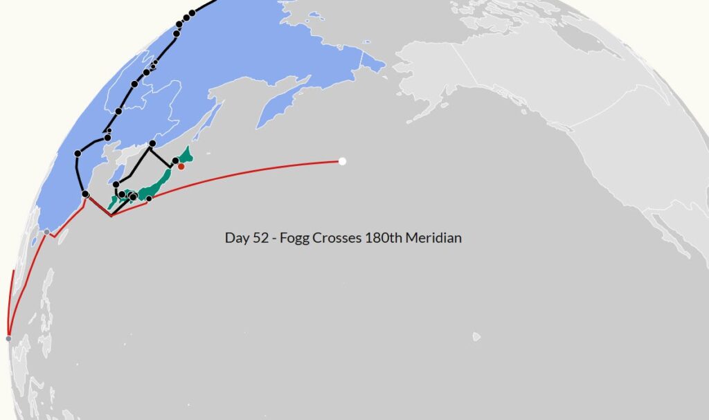 On the 52nd day, Fogg crossed the 180th Meridian on his way to San Francisco, putting him halfway around the world. We just left Japan bound for Alaska. A rough estimate says we are about two or three days behind.