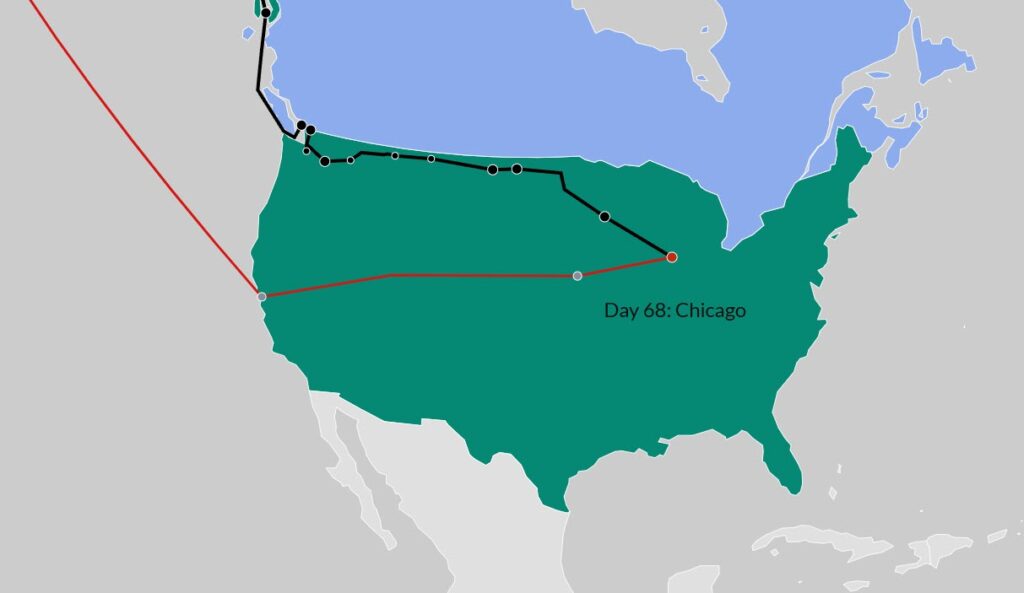 Sixty-eight days into the trip, our journey intersects with Fogg’s in Chicago.
