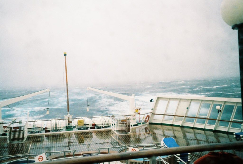 With our porthole bolted shut, we take every opportunity to escape the gloom of the cabin. The fixtures also creak loudly and incessantly with the swaying of the ship. At best, it beats like scattered pellets of rain falling on a windscreen. At its worst, it has the sound of an old vinyl reclining chair being endlessly opened and closed.