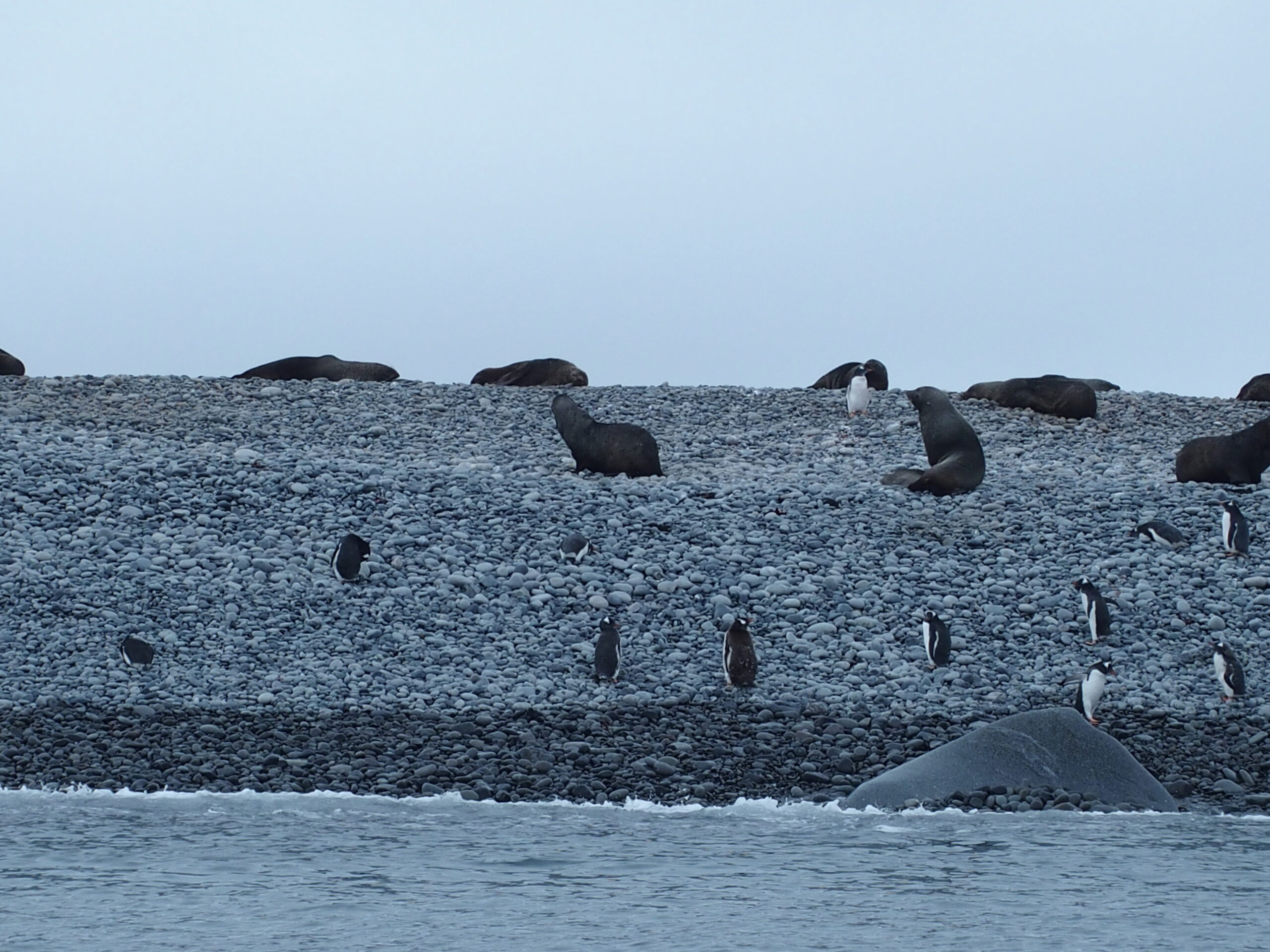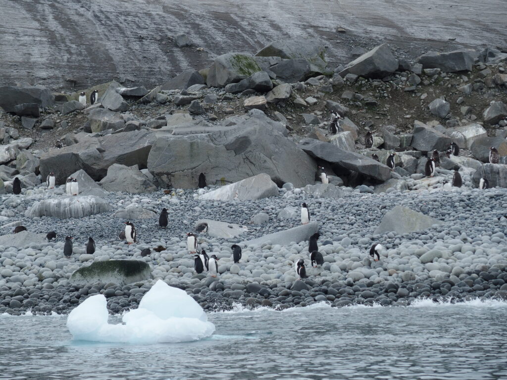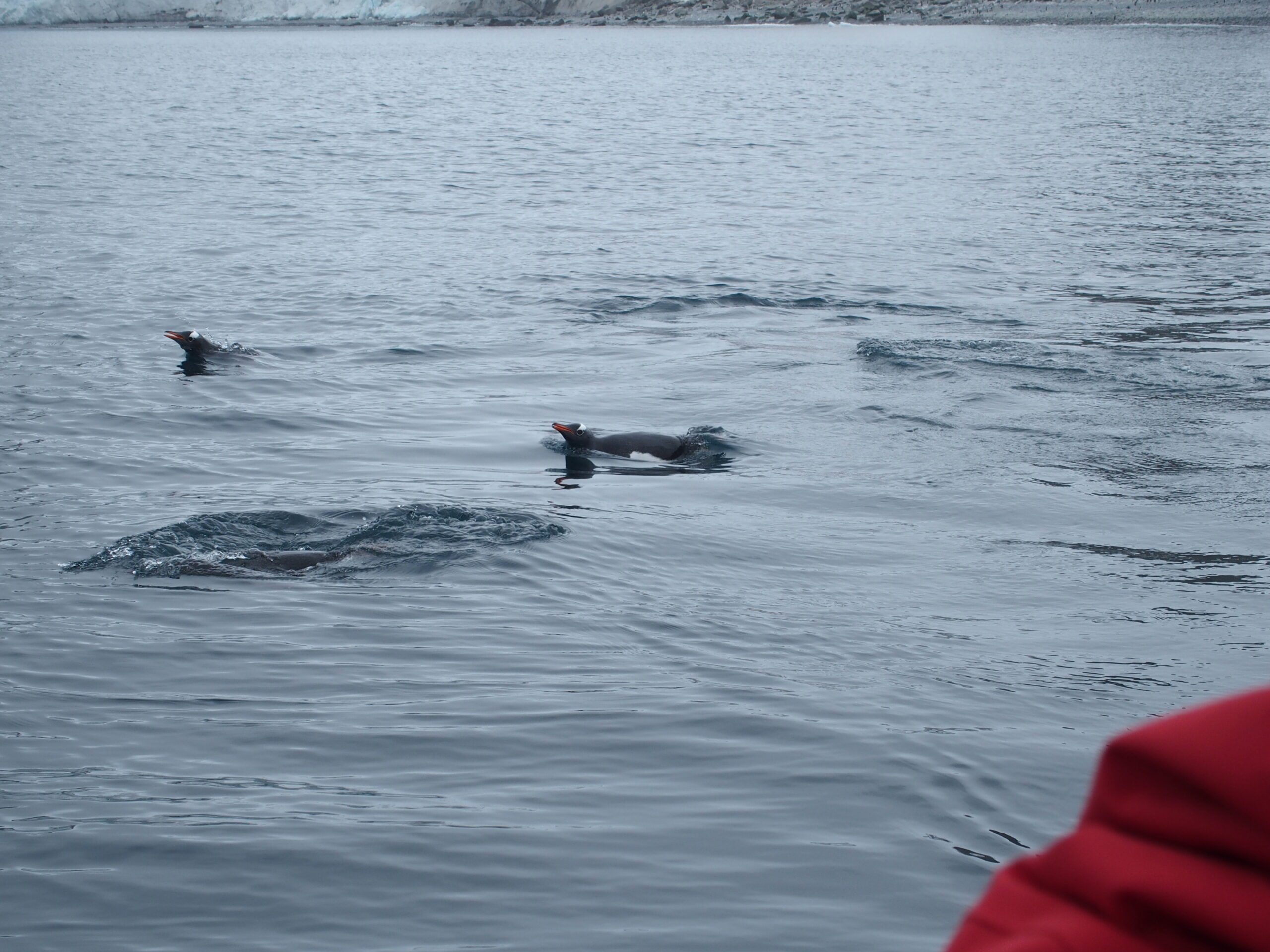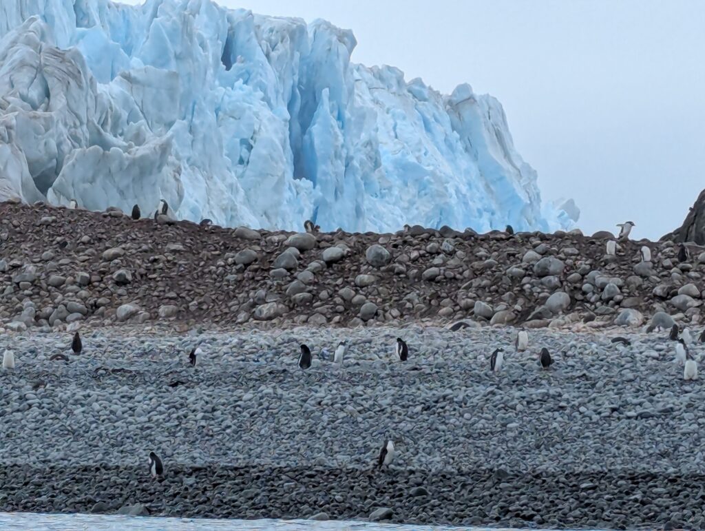 The day began clear and calm, sailing through a handful of icebergs. Water birds circled. In the distance was the plume of a spouting whale. As we drew closer to proper solid land, small pods of penguins jetted around us – breaking the surface like schools of fish.