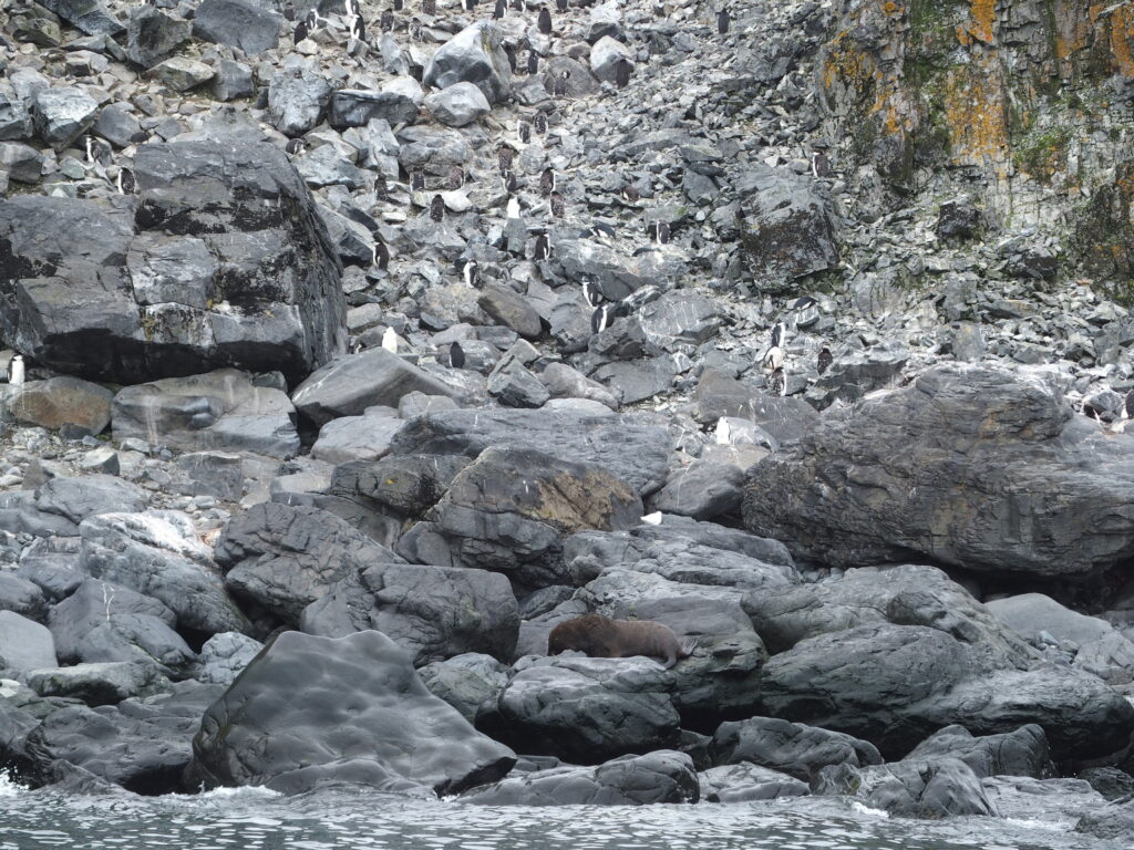 An active set of ‘teenage’ fur seals scrubbed our planned landing at Fort Point today. The crew determined it would not be possible to keep the curious wildlife and the curiouser passengers apart. Instead we cruised along the shore in zodiacs – other groups were out kayaking and in the Special Operations boats. Along the shore, leathery fur seals fought – or play-fought – one another. Inquisitive Gentoo penguins circled our zodiac hoping perhaps the boat’s engine churned up a meal from the sea floor. We knew each time we were downwind of a rookery.