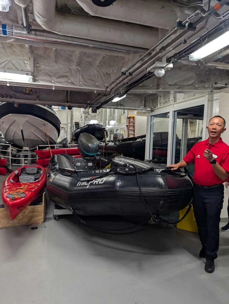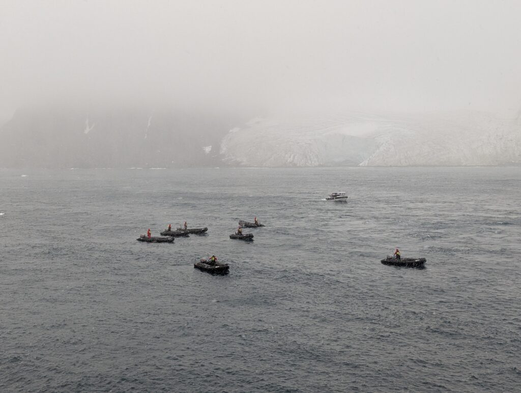 The main activities while at sea were orientation and gear collection. We practiced getting into and out of kayaks from a zodiac. While successful, I admit to still being a bit nervous about it – it is one thing to accomplish this feat in the dry, comfy hold of the ship; quite another in freezing water.