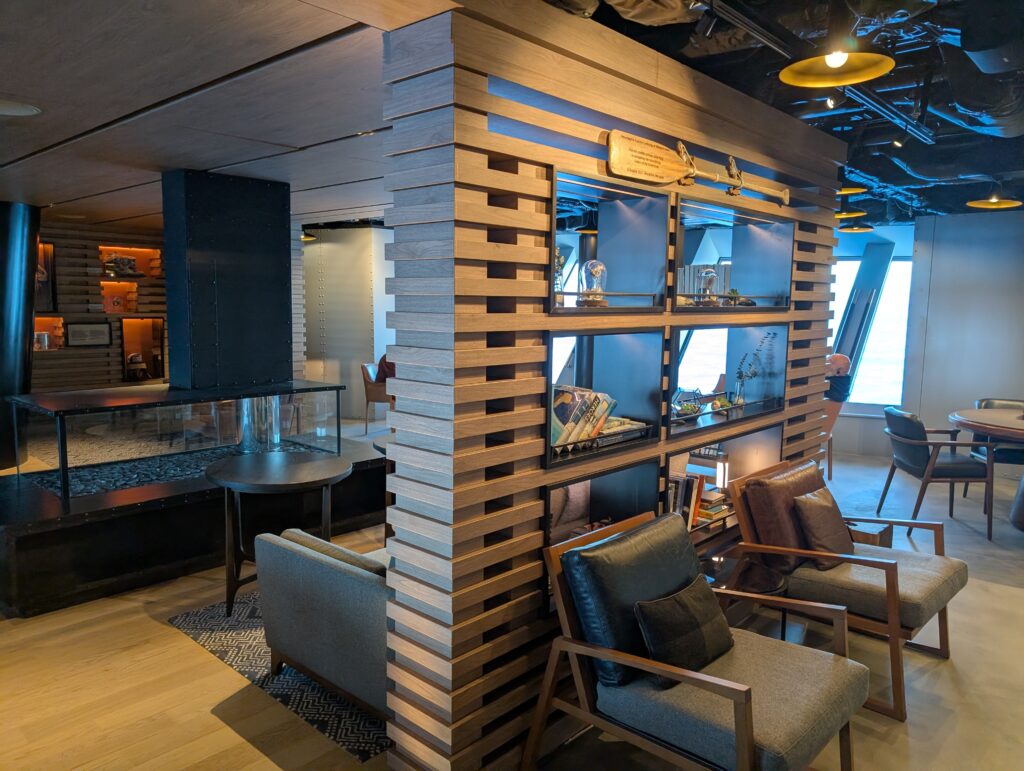 Hidden on the lowest passenger level of the ship, just above water level, is the lounge appropriately named “Hide.” It is a little tricky to get to, hence the name. The Hide is a quiet lounge with comfy chairs and angled windows allowing a dramatic view down into the seas. Liv Arnesen is the godmother of this ship, so the Hide displays artifacts from her adventures – including, of course, Antarctica.