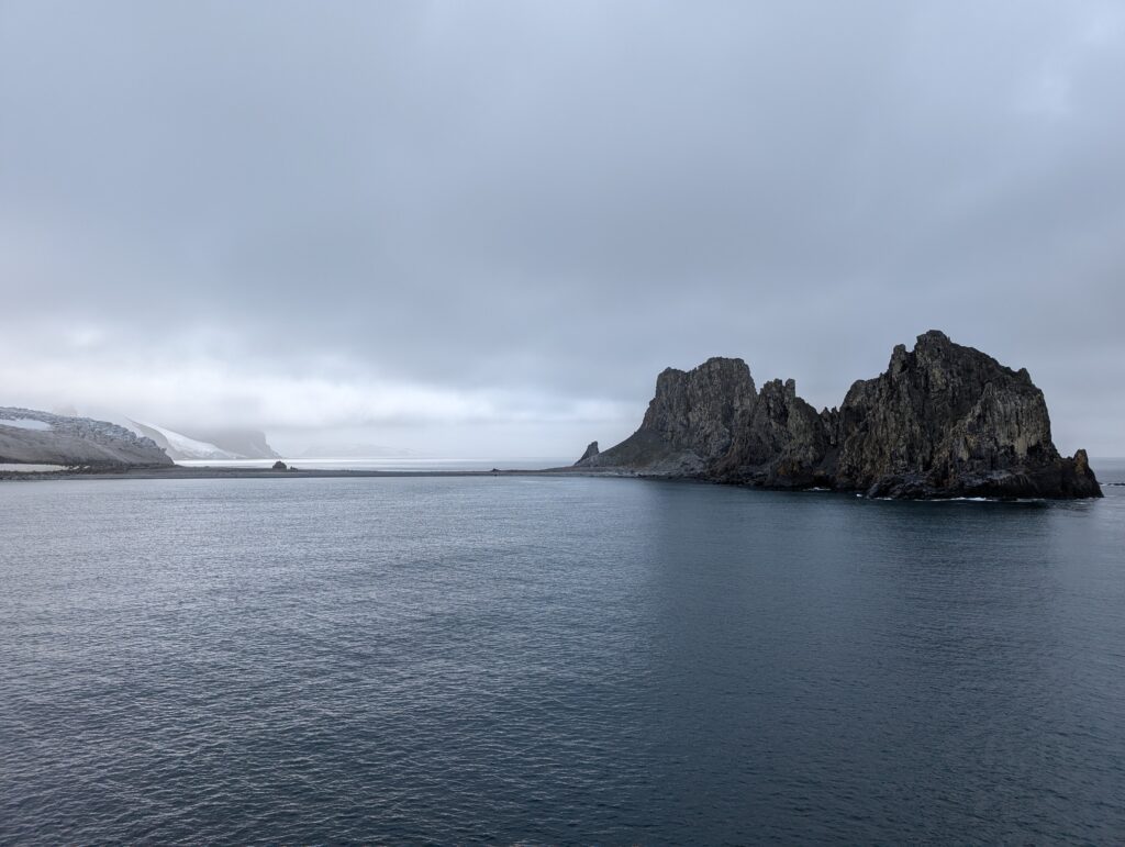 Clouds joined as we threaded between the South Shetland Islands on our way to Greenwich Island, the location of Fort Point. The islands are severe and inhospitable: weathered, grey stone capped with glaciers jutting out of the sea. Some of the ice has a blueish hue, a trait of ancient ice compressed over years. The penguin rookeries add a pinkish tint courtesy of penguin guano and their krill-heavy diet. When the wind shifts, the aroma of rookery assaults our noses – an amalgam of rotten fish and teenage boy.
