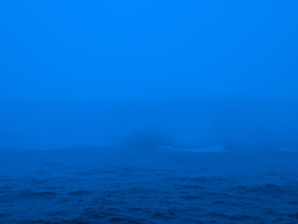 At first, it was only visible by contrast: a different shade of blue between the sea and the sky. The cavern was visible first – a dark shape in the fog. Other details teased out slightly. The iceberg remained so shrouded that other perspectives like size and height were not possible.