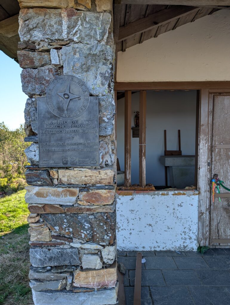 The only major site of the day was the ruins of Capilla de Hospital de Montouto. It was founded by King Pedro I of Castille in the 14th Century and still in use into the 20th. King Pedro also went by the moniker “Pedro the Cruel” so it was fittingly at the highest altitude point of the day. There was a plaque celebrating human rights – a Camino de los Derechos Humanos. I don’t know if this is a separate physical as well as spiritual route. Either way, this site celebrated the Right to own property.