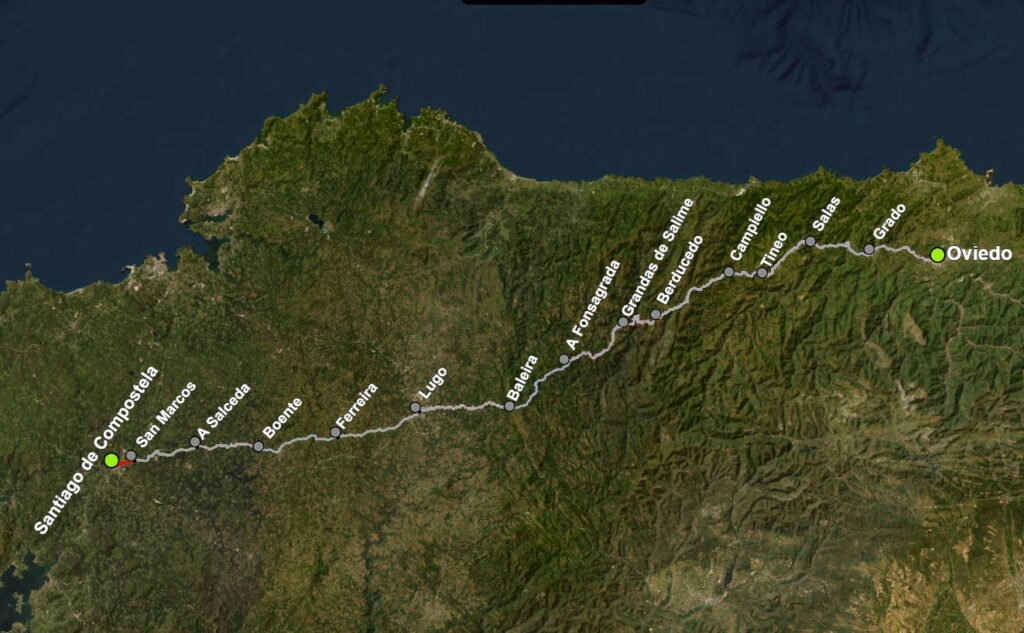 The day began in the inky pre-dawn. My feet groaned, partly in relief knowing that the trek was nearing an end. San Marcos was still asleep as we trudged towards the cafe that the hotel guaranteed would be open for a light breakfast. Which of course it wasn’t …because Spain. With our headlamps lit, we wound through the narrow streets until we saw the familiar scallop shell. We were back on the Camino route. There was a short pause as we pulled out a breakfast bar before continuing on.