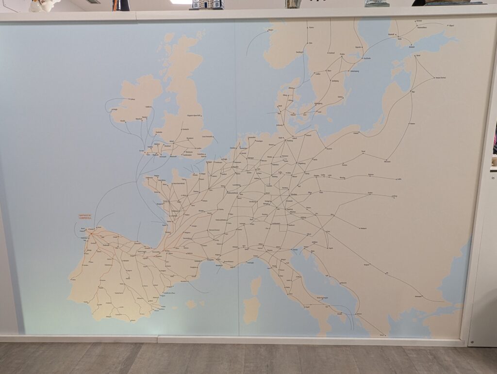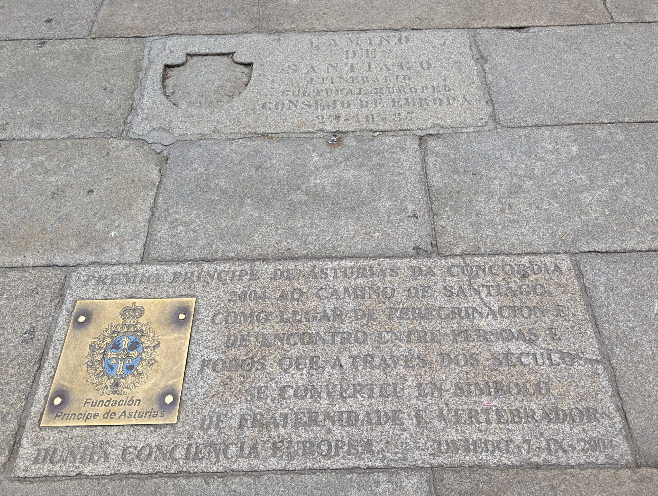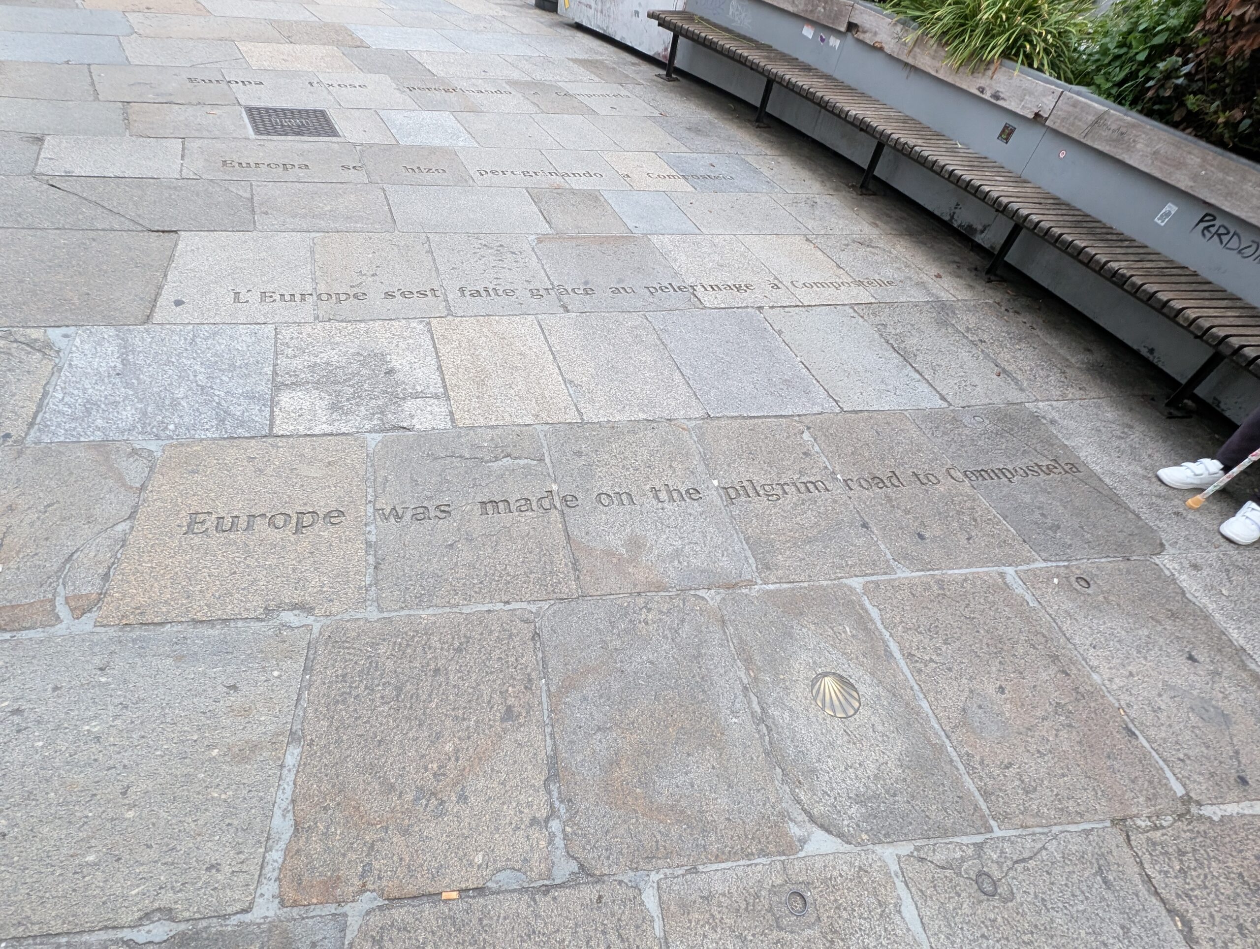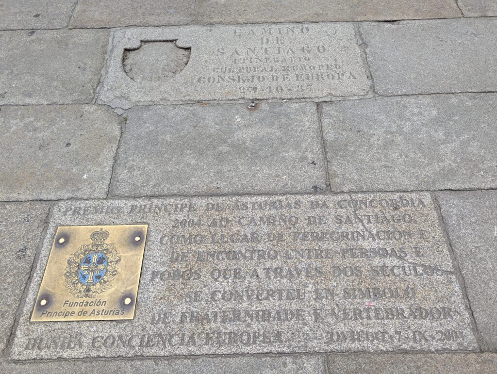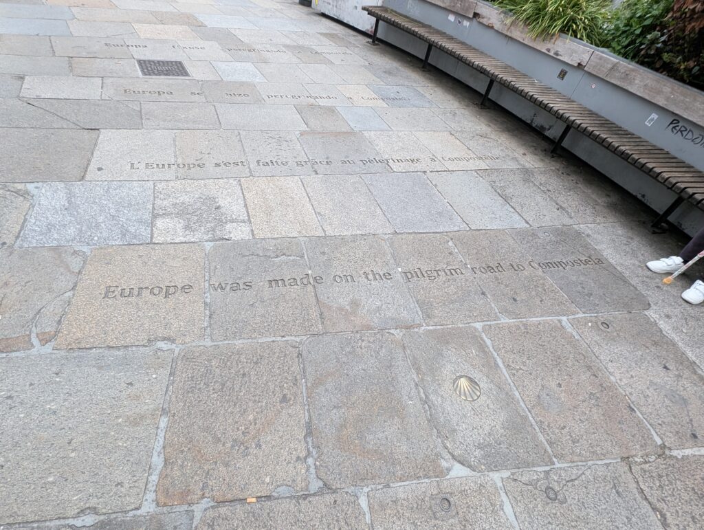 Mounted police watered their horses at public fountains. Signage celebrated the Camino and peregrinos. My favorite saying, etched into the pavement, proclaimed in many languages, “Europe was made on the pilgrim road to Compostela.”