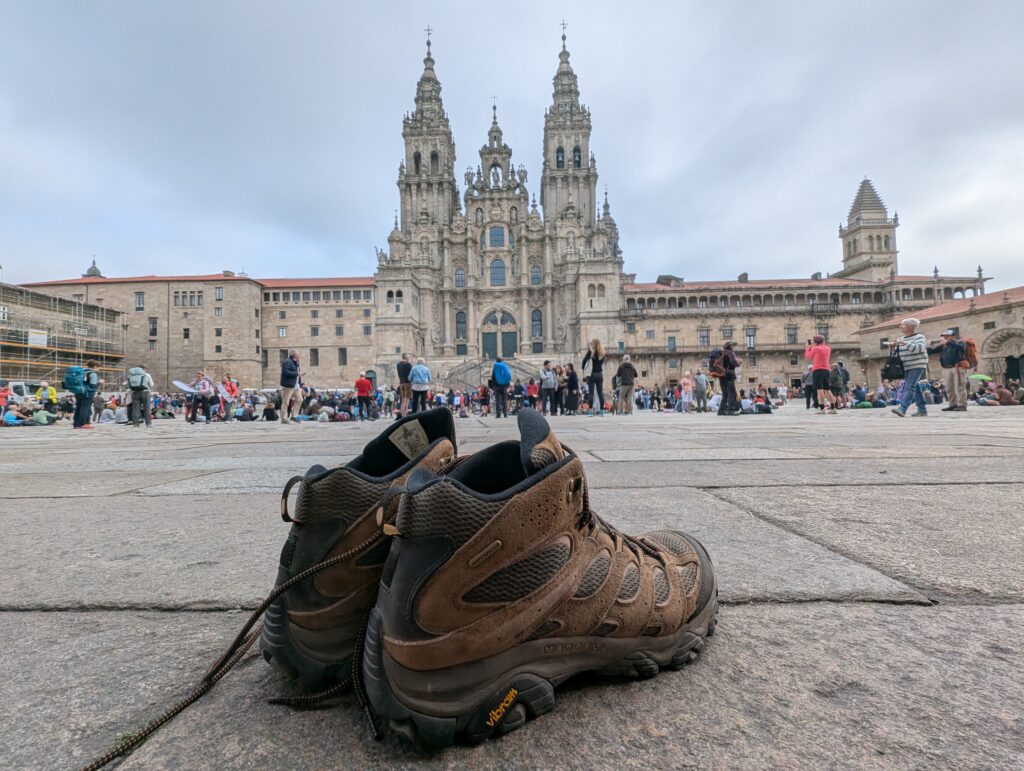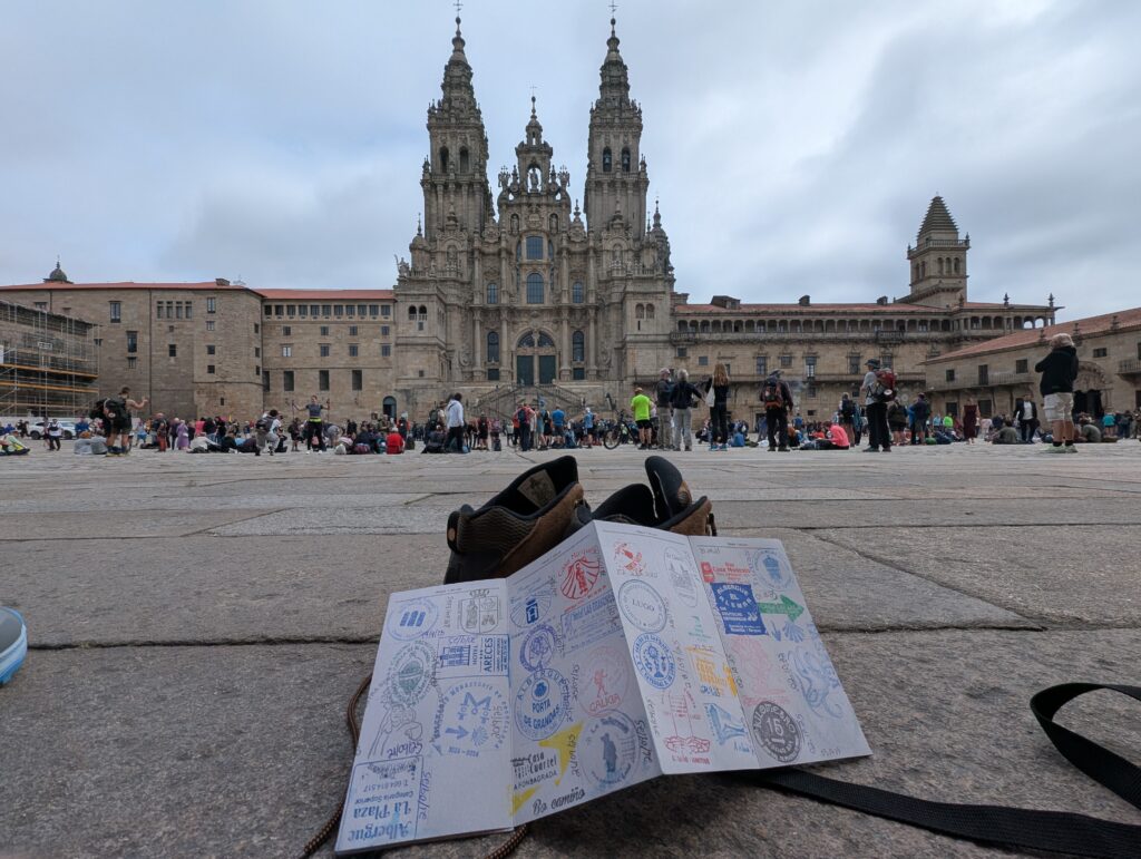 The buzz and drone of the bagpipes reassure us we are getting closer. We pass the piper sheltered under the final stone arch and enter the Praza do Obradoiro. The square in front of the cathedral is full of clusters of pilgrims, large and small, celebrating in their own way. And the requisite selfies with the cathedral in the background. It was still early in the day so the crowds were lighter. The square certainly filled up as the day went on.