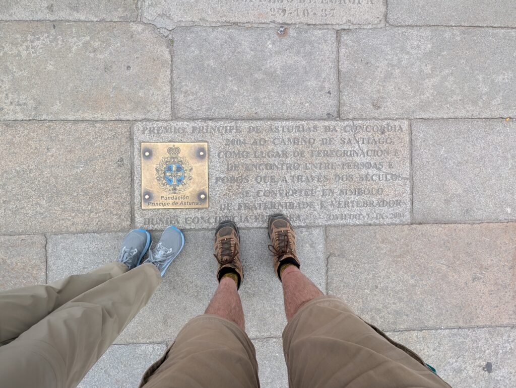 Pavement gave way to flagstones. The stone buildings of Santiago make a labyrinth, denying a view of the cathedral until the final moments. Progress requires being in full treasure hunt mode looking for signs, clues of the route forward. Some of the brass shells embedded in the pavement have gone missing. It felt like the orientation of the markers was in Asturias mode, where the lines on the shell indicated the direction instead of the arrowhead shape. This misunderstanding sent us through one park before we realigned.
