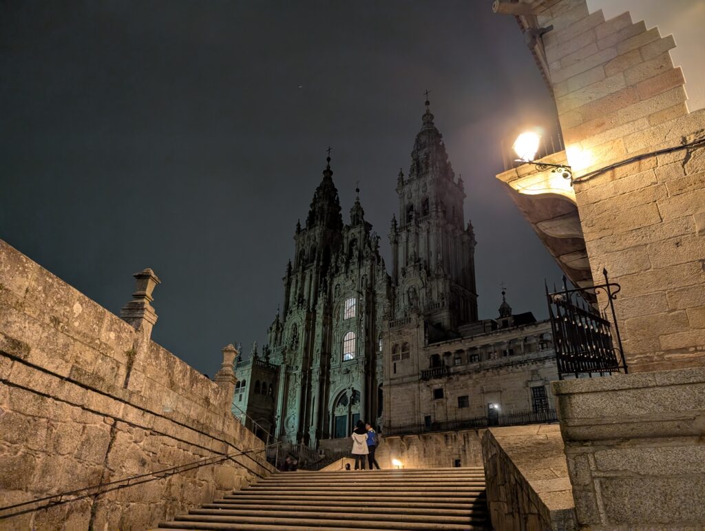 The park at Monte do Gozo (the “Hill of Joy”) promises the first glimpse of the Cathedral on a clear day. The overlook also features stylized statues of pilgrims celebrating the near completion of their journey. As it was, the skies were overcast. The few lights in the park provided little assurance that we could find our way to the statues. The uneven ground was an additional risk for Anna, still nursing injured feet. We chose to skip trying to find the site and instead continue into Santiago.